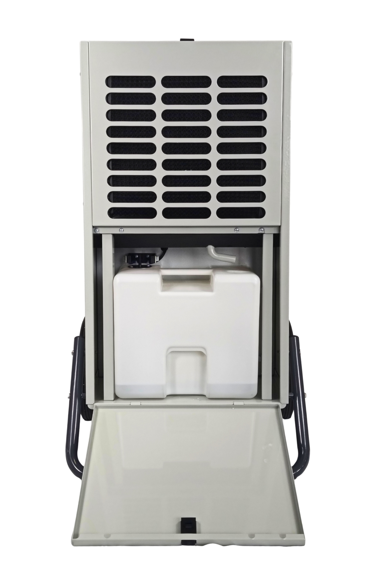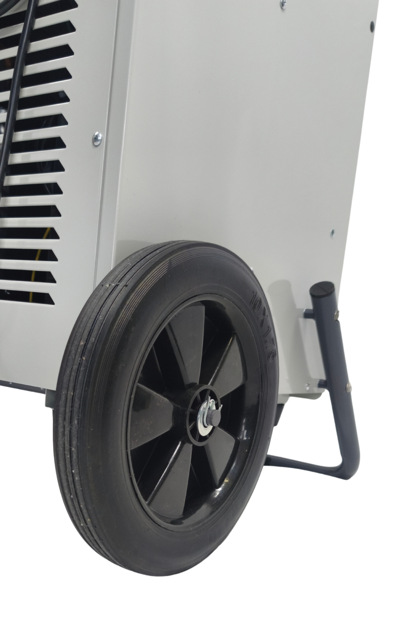 Nonostante le dimensioni e le prestazioni, l'essiccatore industriale è mobile: il trasporto è facile grazie alle maniglie e alle rotelle, e due unità possono essere impilate per risparmiare spazio grazie a speciali paracolpi in gomma. Altri dettagli ben studiati sono il serbatoio della condensa rimovibile con funzione di arresto automatico quando è pieno e la pratica opzione di collegamento del tubo flessibile per lo scarico continuo della condensa.